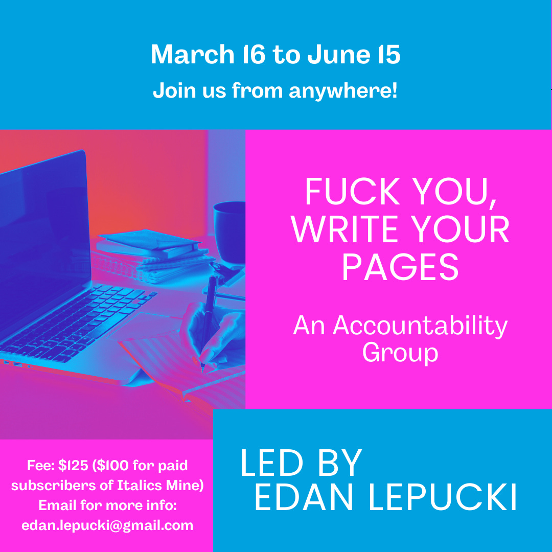 The fall session of my accountability group, Fuck You, Write Your Pages, will begin Monday, March 16th. There are spots open!